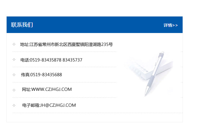 地址:常州市新北區友邦商務大廈1幢16、17層  電話:0519-85101652  傳真:0519-85112595  郵編:213022  網址:www.cz-jiayue_cn.bookgs.com  郵箱:xiajifengaa@163.com